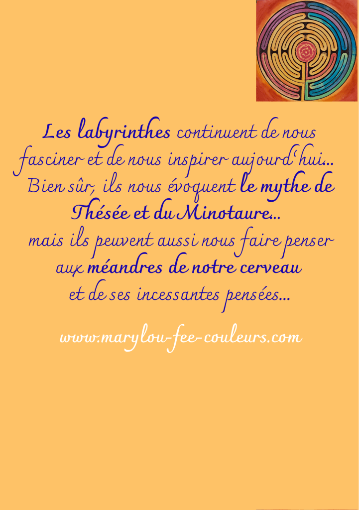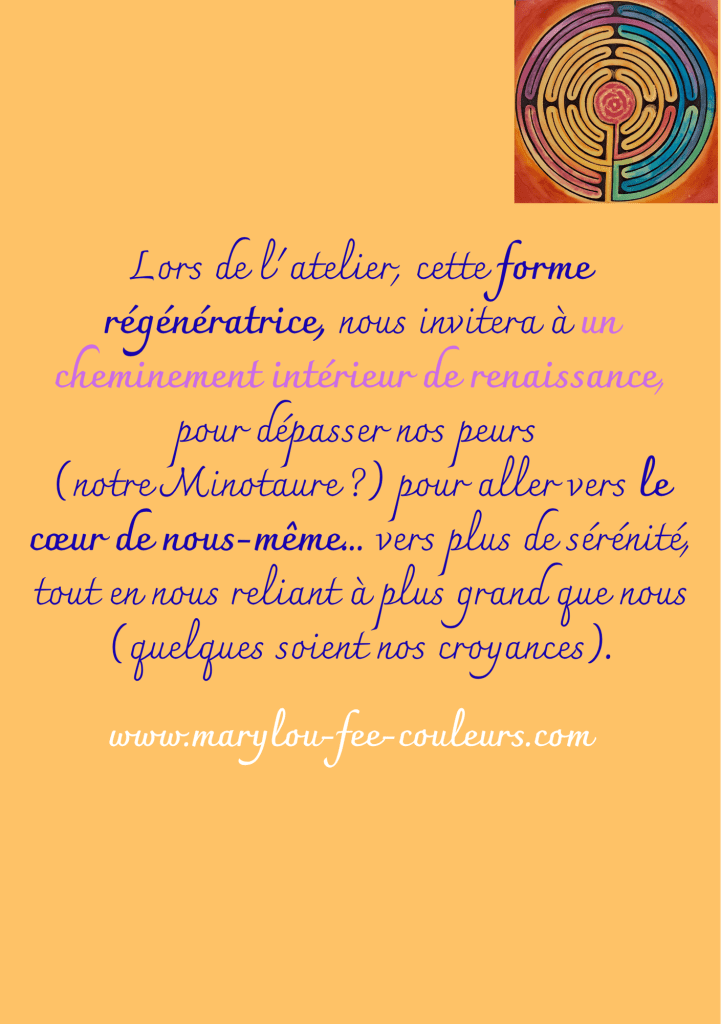 Lors de l’atelier, cette forme régénératrice, nous invitera à un cheminement intérieur de renaissance, pour dépasser nos peurs (notre Minotaure) pour aller vers le cœur de nous-même... tout en nous reliant à plus grand que nous (quelques soient nos croyances).